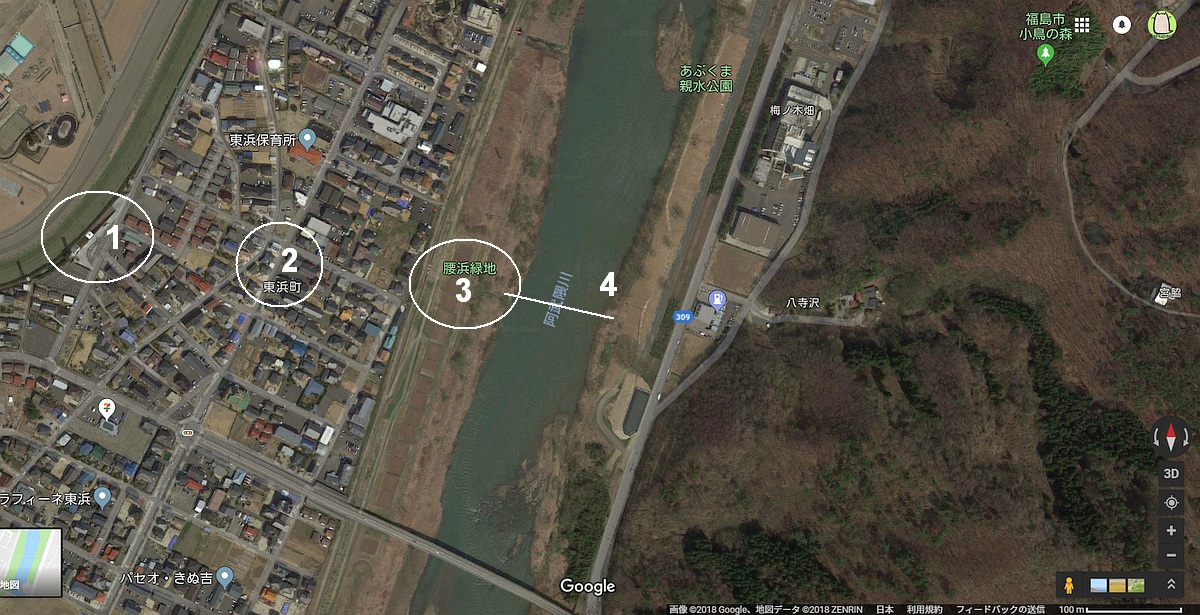 私が訪ねてほしいのは、福島競馬場裏手(門の周辺)と、その東側を流れている阿武隈川の土手道です。