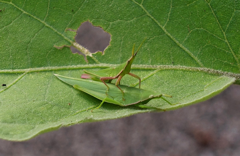玄関のすぐ前に、オンブバッタがいた。名前の通りオンブしている♂と♀。