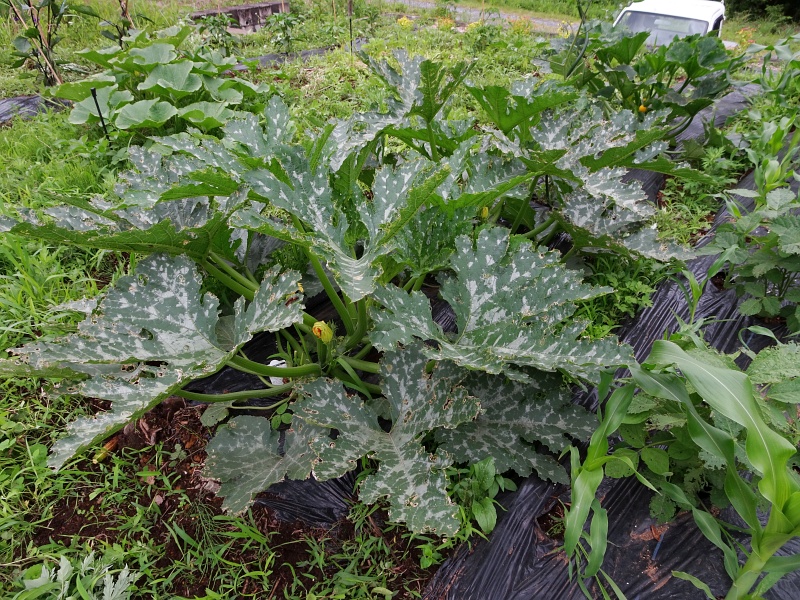 巨大な葉っぱは花ズッキーニ。葉はだいぶやられているが、花の部分はきれいですでにだいぶ収穫したらしい