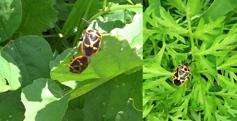 ニンジンの葉っぱにいたカメムシ。ナガメより模様が複雑なヒメナガメという種類