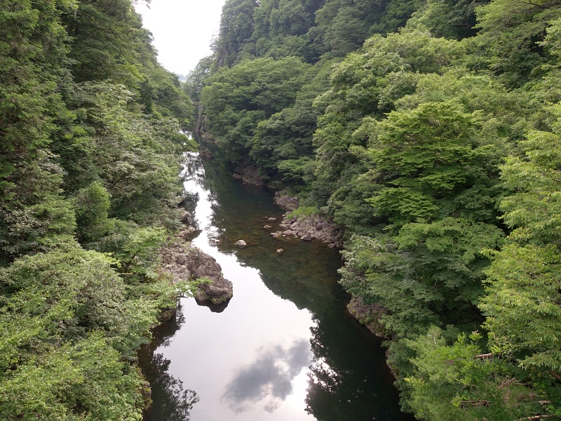 わらべ橋から下を見たところ。きれいな渓谷に魚が跳ねていた