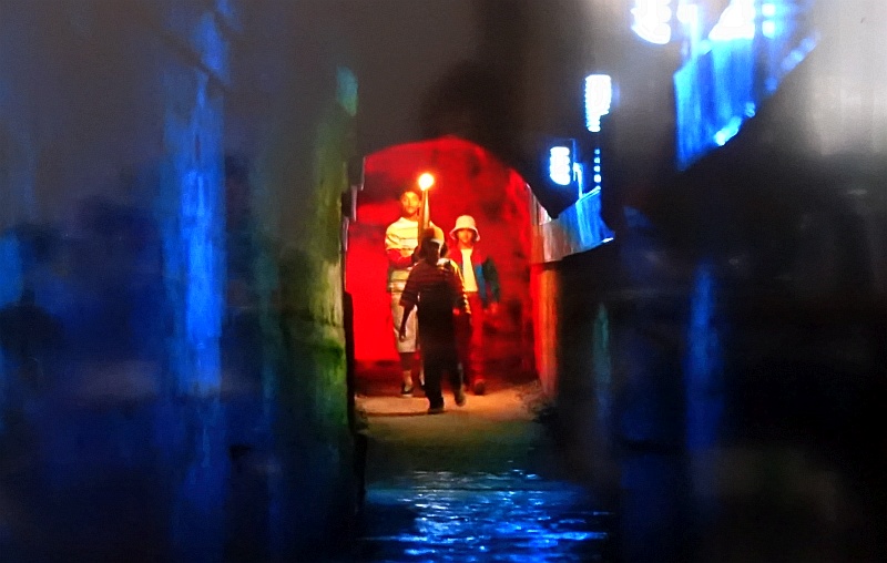 ワニも泳ぐ地下水路に、顔を隠した怪しい人物がボートで現れ、子供たちを乗せる(おいおい)