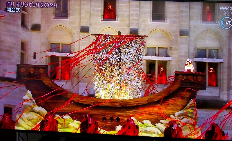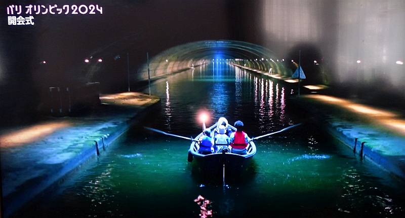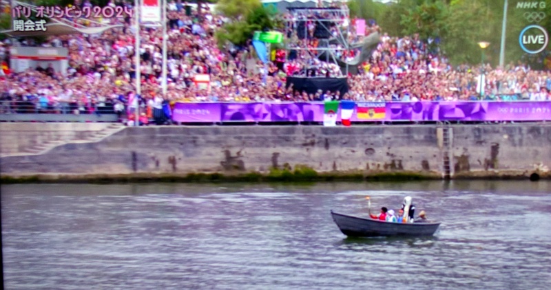 怪しい人物(死神?)と子供たち(と聖火)が乗るボートは濁ったセーヌ川に出て行く。その後ろに、各国の選手&スタッフを乗せた85隻の船が続く