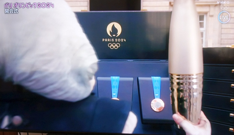 インサートでメイン会場のマクロンとバッハが映し出される。会場には謎の動物の像も
