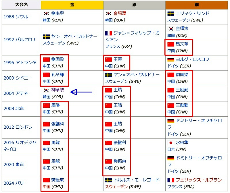 そういえば中国選手同士が決勝で対戦している図はいっぱい見たなあ。1位と3位になったときも、準決勝で中国選手同士があたった結果なのだね。