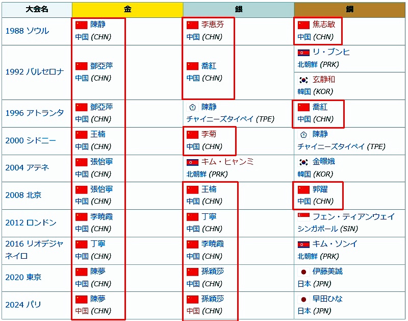 女子はさらにものすごい。卓球が五輪種目になったソウル大会以降、9連勝中。今回、ついに10連勝。しかも金・銀が7回。今回も陳夢選手と孫穎莎選手の中国同士の決勝になった。