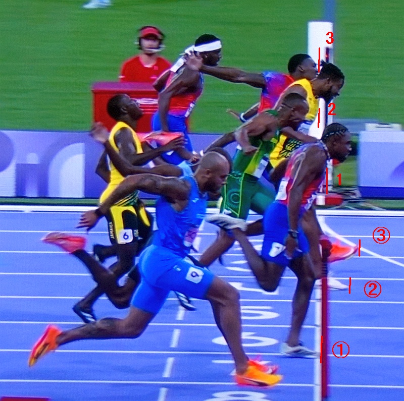 靴先がゴールラインを割った順番(○付き数字)とトルソー(胴体)がラインを割った順番