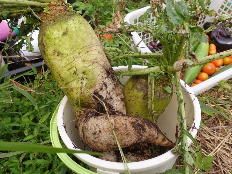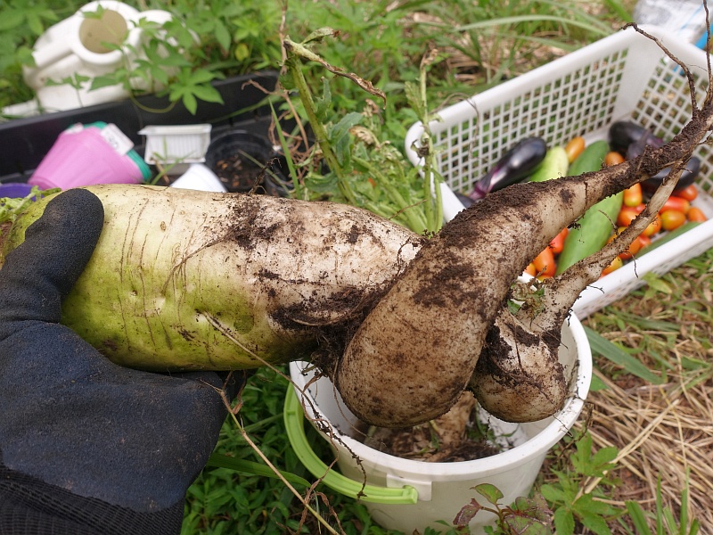あんなにあった大根も、気がつくと「あれ? どこだっけ?」という感じで、埋もれている。久々に2本引っこ抜いてみた