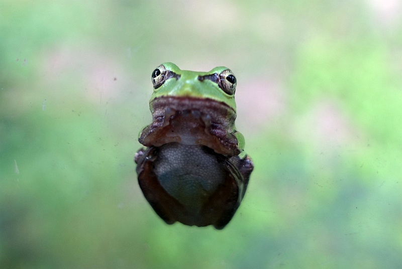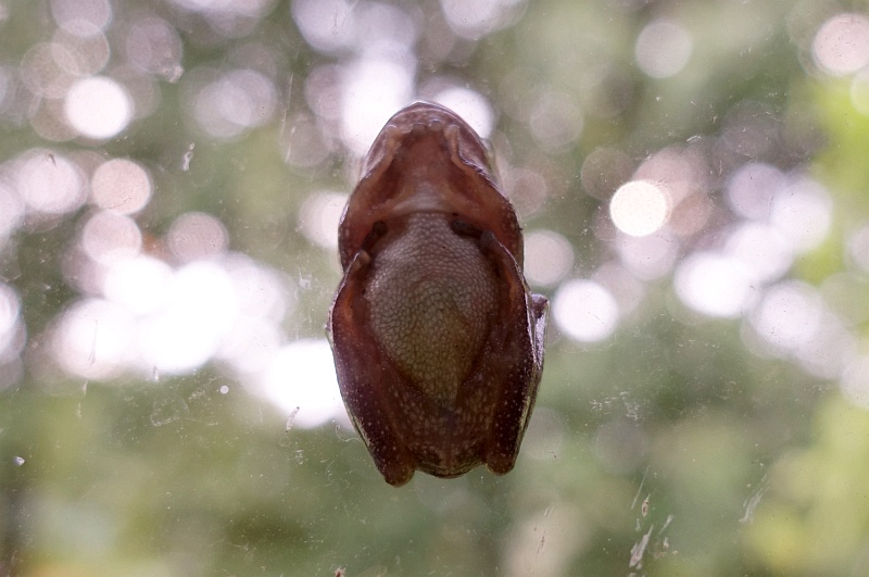 二階の踊り場の窓に貼り付いていたアマガエル