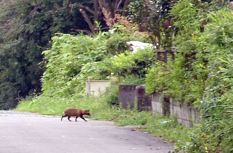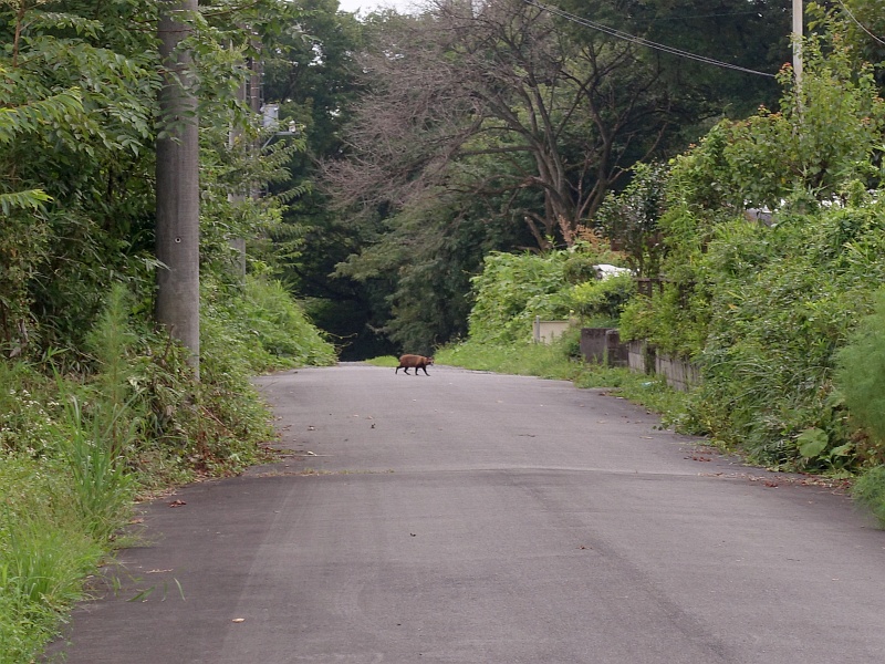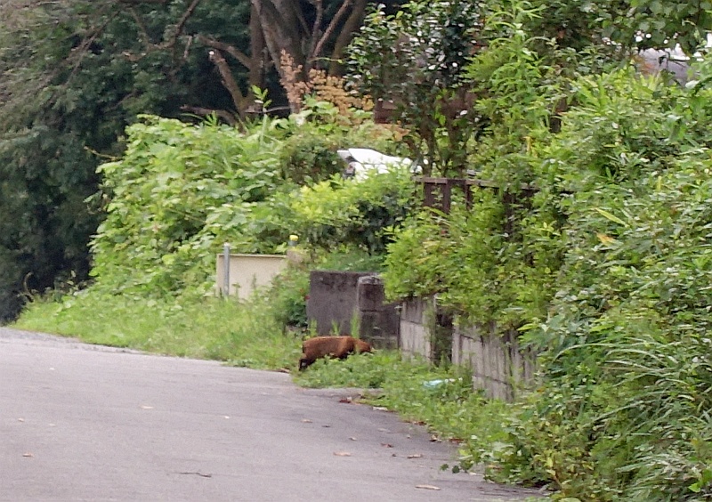 今日のたぬ吉。こないだと同じ場所(道路)で寝そべっていたが、あたしの姿に気づいて、ゆっくりと民家に入っていった。