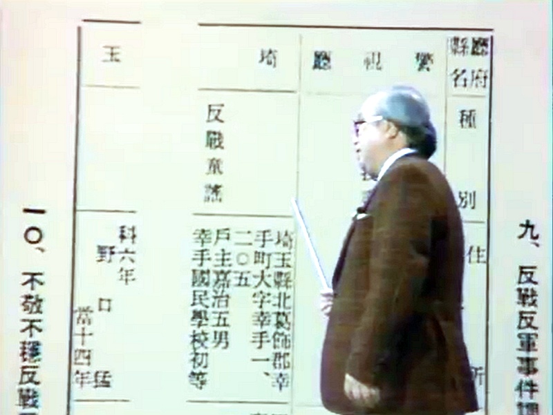 ↑この番組、「その2」では、翼賛選挙に大量の無効票(投票用紙に落書きや不平を書き連ねたもの)があったことや、特高が膨大な資金を得て反戦思想と思えるものを徹底的に弾圧し、替え歌を歌っていた子供まで取り締まった記録などが紹介されている。