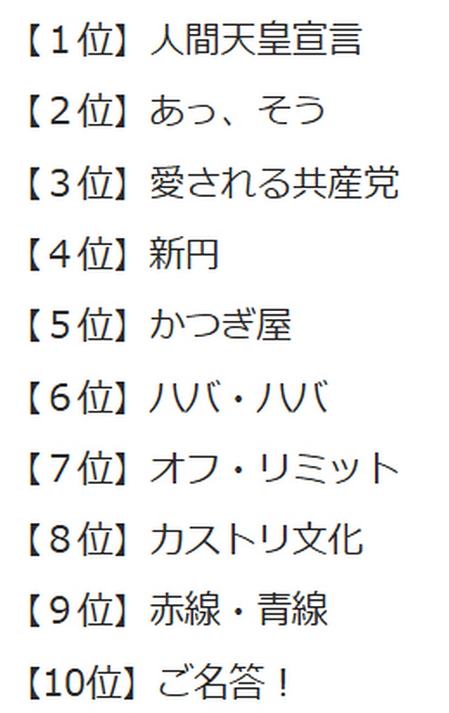 昭和18(1943)年の流行語トップ10だそうだ。どうやって順位をつけたのかよく分からないが、戦時中も政府に抵抗する庶民がいたことは分かる。