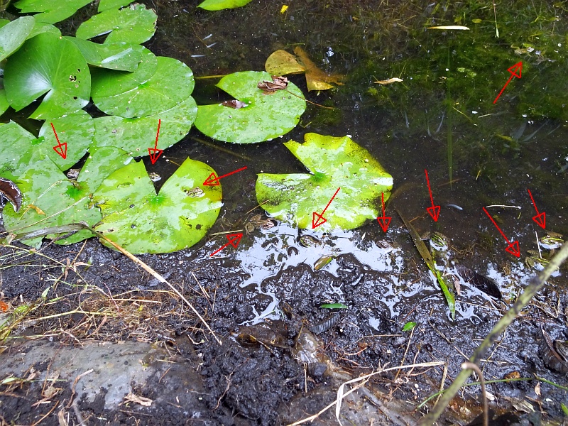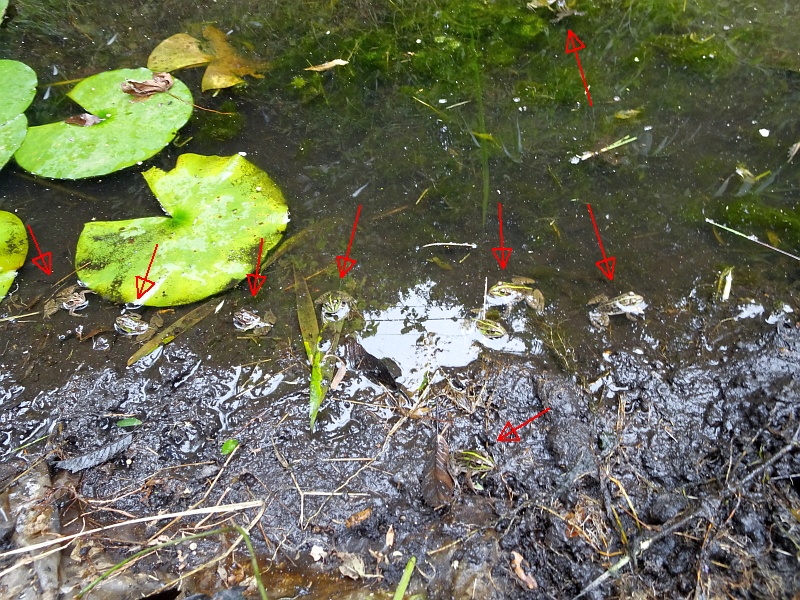 水が減って底が見え始めている池にはトウキョウダルマガエルが数十匹。近所のトウダルが全員集合状態。