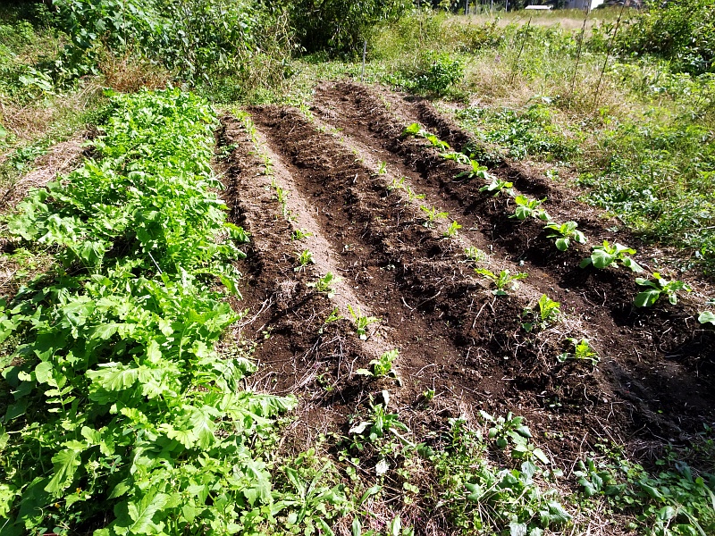 今のところ順調っぽい。その右2列は後から植えた大根。いちばん右の列は苗で植えた白菜。さてさて、どうなることか。