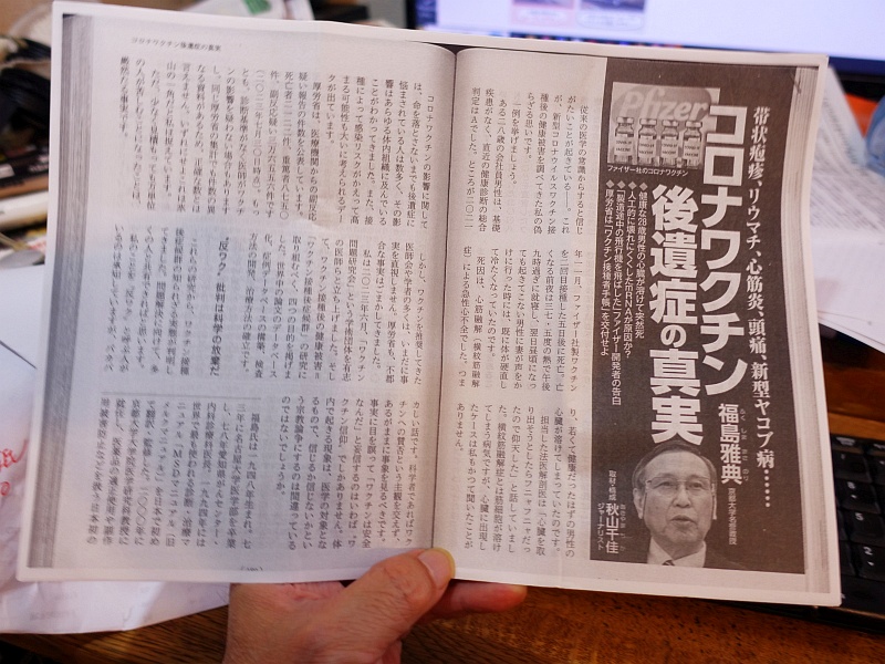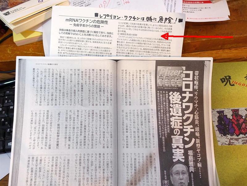 今回はmRNA遺伝子製剤禍についての啓蒙運動らしい。自家製のプリントと文藝春秋の記事コピー、関連書籍などを差し出された。