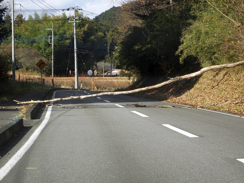 買い物に行く途中で、前のクルマが変な動きをしているので何だろうと思ったら、倒木だった