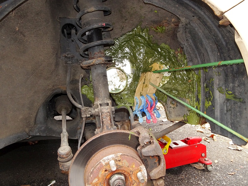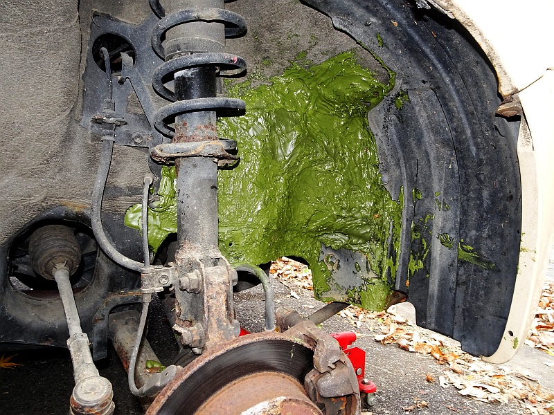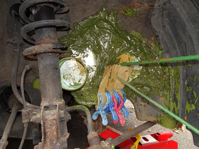 とりあえず今日はここまで。明日までにどれくらい固まってくれるか……。トタン板はパコパコ浮いてくるし、フェンダー側の穴をふさいだ小さい板は何度もポロッと落下するし……先行きは暗い。