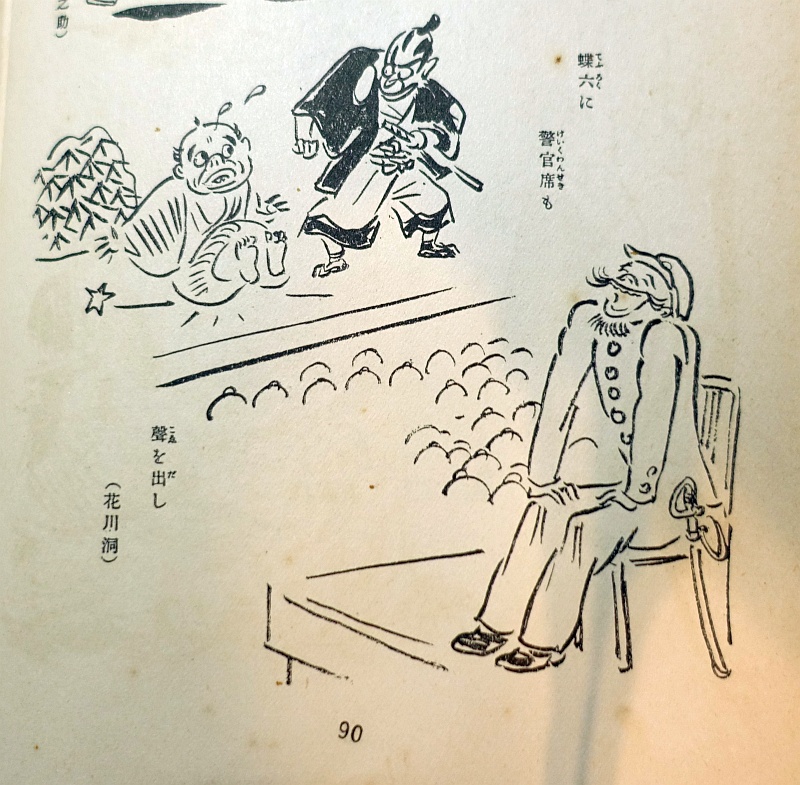 「蝶六に警官席も聲を出し」……蝶六は役者の名前だろうか、それとも演目? 警官席というのは、反政府的な演目や台詞などがないか、公安が見張るためのものだろう。1925年(大正14年)に治安維持法(大正14年4月22日法律第46号)が制定されている。