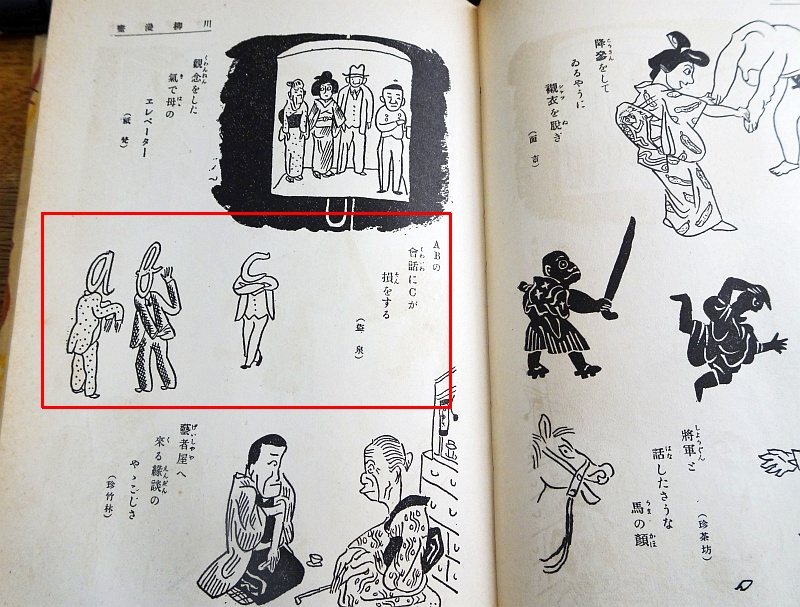 古川柳と記されている川柳は江戸時代のものだろう。その後に続く「滑稽俳句」という章は、明治以降、同時代(大正末期から昭和初頭)のネタ。ABCD包囲網というのができるのはもう少し後だが、この時期、すでにAはアメリカ、Bはイギリス(ブリテン)、Cは中国という頭文字での表現はあったのだろうか。「ABの会話にCが損をする」……中国の処遇を巡って米英が密談しているという図だろうか。