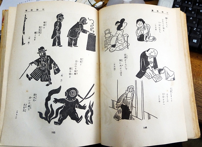この本の内容は、江戸期や昭和初期の川柳、小咄などに挿絵(漫画)をつけて編纂したという、大変ユニークなものだが、当時極めて高価だったはずのカラーオフセット印刷を使ったケース入りハードカバー本という豪華な仕上げで「非売品」。商業的な目的ではなく、資料として残したいという強い意志を感じさせる。