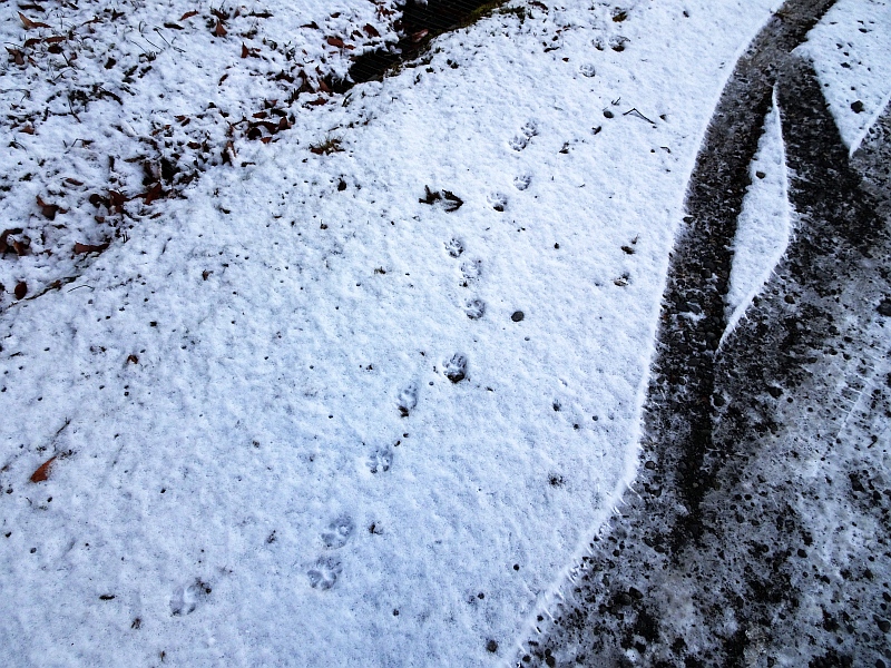うっすら残っている雪の上に狸の足跡らしきものが続いていた。その先はズボラ苑だけど、食べ物はないから、ただの通り道にしているだけかな。