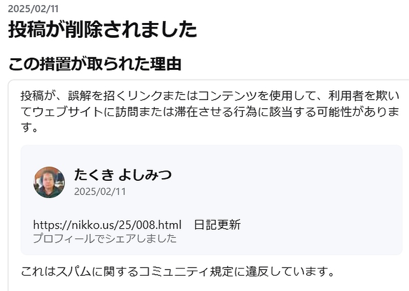 フェイスブックに「日記更新」という、いつもの投稿をしたところ、詐欺投稿だとして削除された。