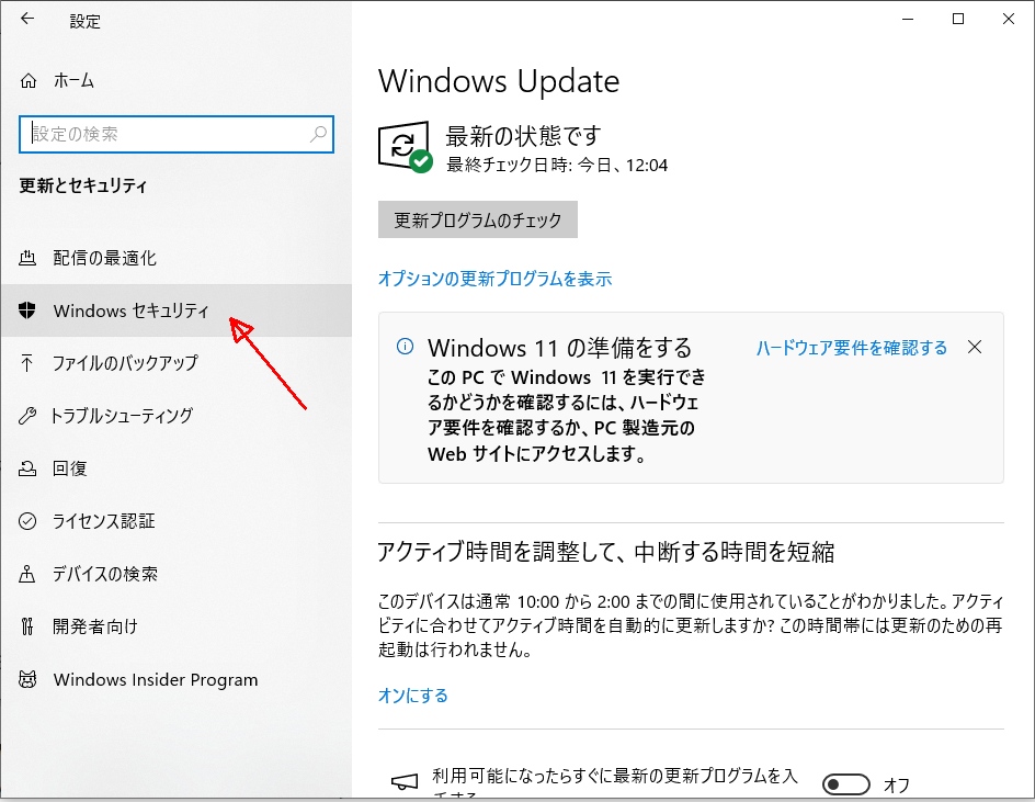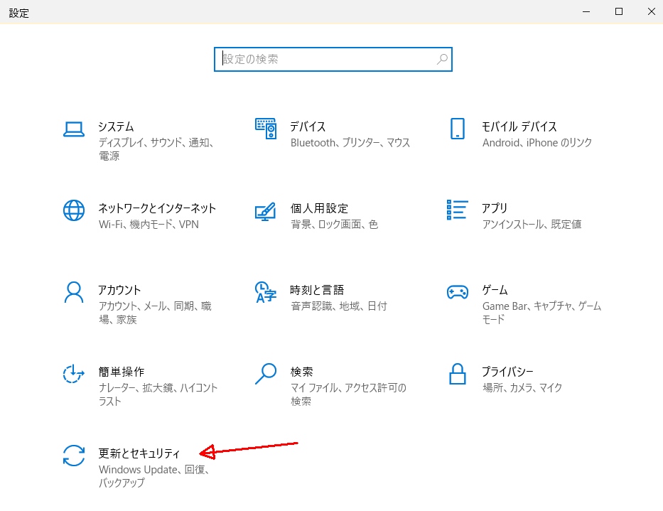 Windowsの「設定」⇒「更新とセキュリティ」を開く