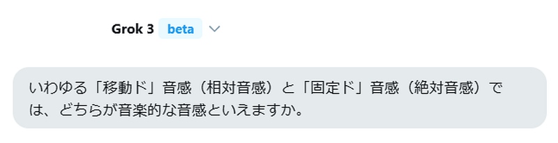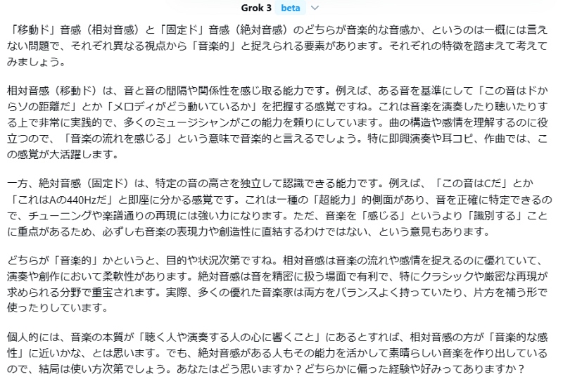 この質問を書き込んだときは、Grokが「固定ド/移動ド」とか「相対音感」といった言葉をちゃんと理解できるのかな、という思いがあった。トンチンカンな答えが返ってくるか、せいぜい「言葉の定義」みたいなものを返してくるだけだろう、と。