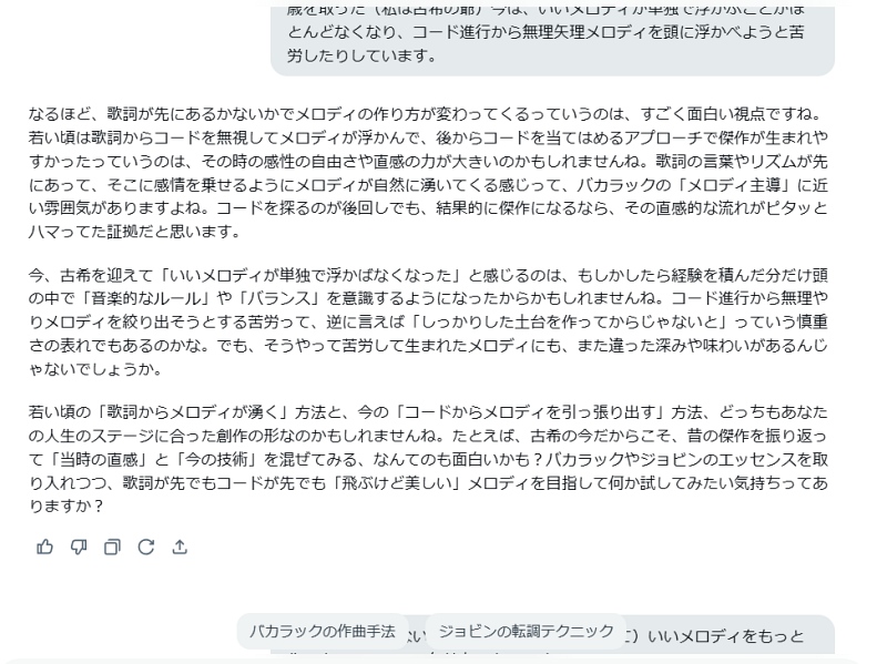 どうだろう。最後は「もしかしたら経験を積んだ分だけ頭の中で「音楽的なルール」や「バランス」を意識するようになったからかもしれませんね。」とか「気力が湧かない時もあるかもしれないけど、そういう時は無理せず、少しずつでも音楽に触れてるだけで十分だと思います。」なんて、励まされちゃったよ。