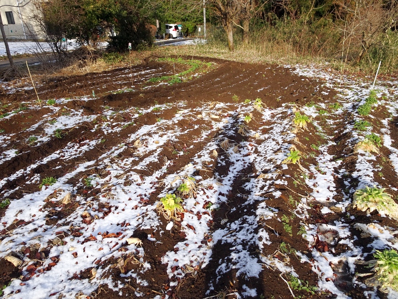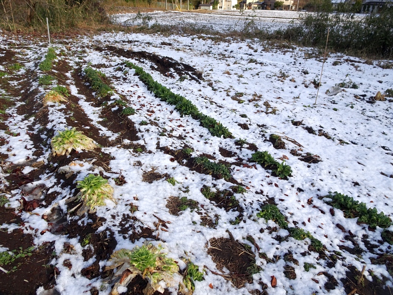 夜、雪が降った翌朝のズボラ苑。ホウレンソウは雪にも負けないで冬を越している