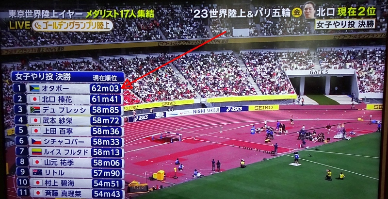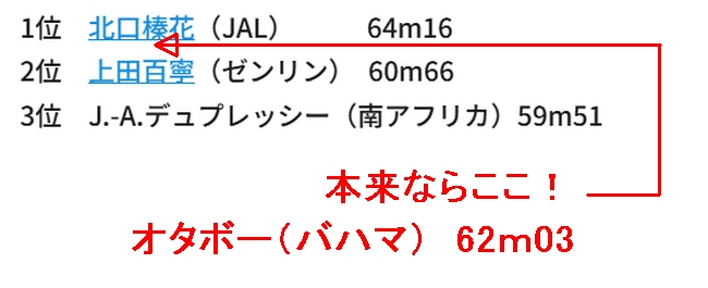 最終的にはこうされてしまい、3位内にさえ入れなかったオタボー。ワールドランキングに大きく影響する大会だけに、腹立たしい。こんな疑惑の判定がなければ4回目以降も気分よく投げられて、北口榛花を再逆転していたかもしれないのに。どこがどう問題だったのか、大会側からの詳細な説明もなかったようだし、まったく恥ずかしい。