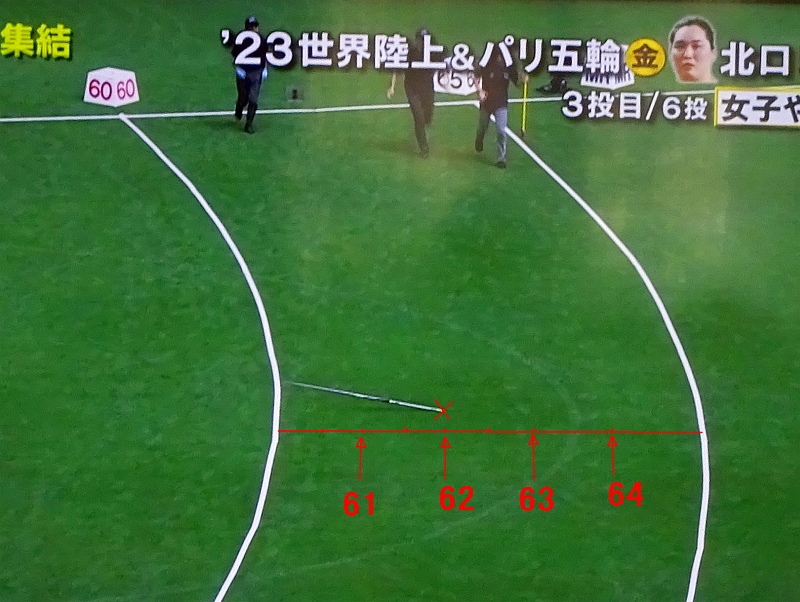 計測に疑問が生じたというが、画面で見ても確実に62mのところに落ちている
