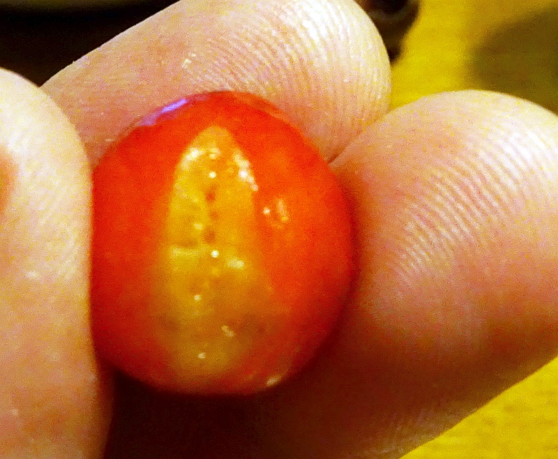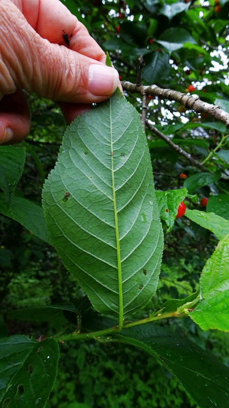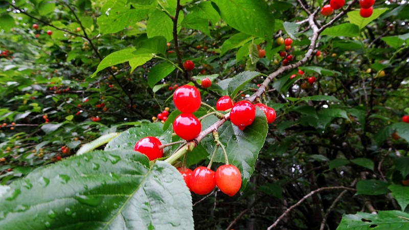 ユスラウメにしては軸が長いという指摘があるのだが、さくらんぼは枝の上に突き出すように出るのはないらしいし、うっすらとだが、実に縦の線が入っている感じなのはユスラウメの特徴らしいし……。