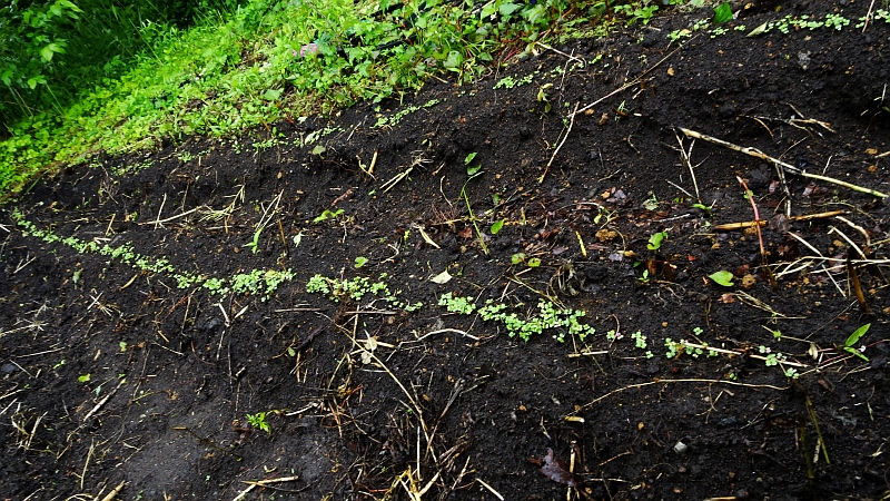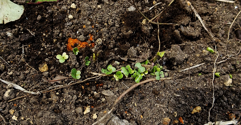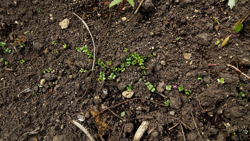 先週木曜日の午後に蒔いた小松菜の種が発芽した。ちっこいな。