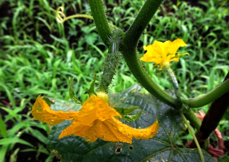 キュウリの蔓って面白い。どんくさくて、支柱と反対方向に一生懸命伸ばしているやつもいる。「そっちじゃない!」と叱りたくなる