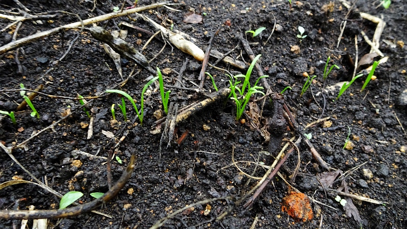 ホウレンソウの種が発芽した。小松菜は丸い子葉なのに、ホウレンソウは細長いのね。問題はこれから天候が不順なので、育つかどうか……