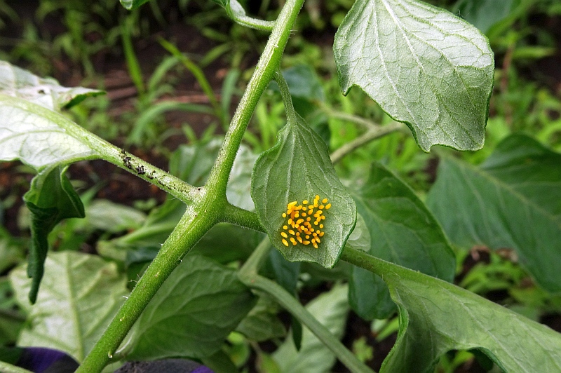 トマトの芽かきをしているとときどき見つけるこれ。ニジュウヤホシテントウの卵だと思う