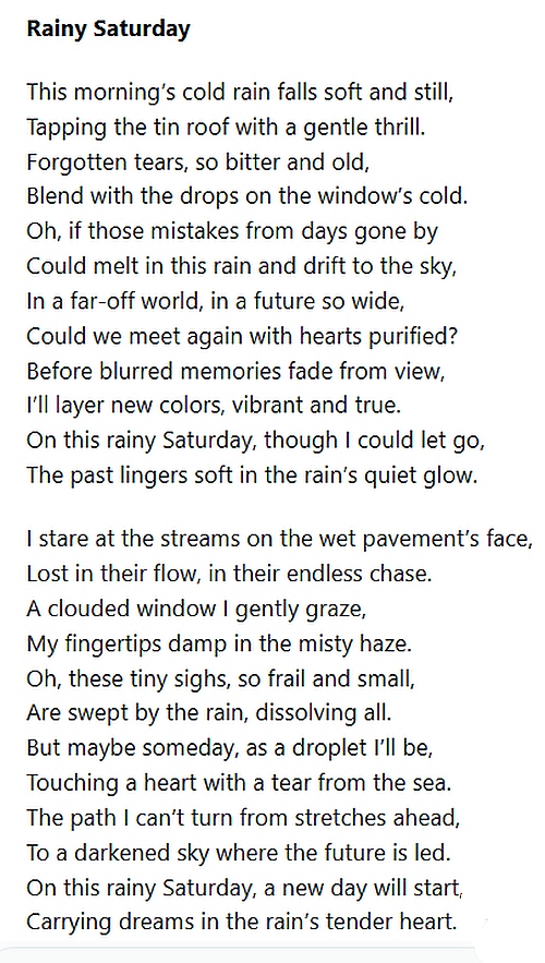 I aimed to keep the melancholic yet hopeful tone, weaving in rhymes (like “still/thrill,” “by/sky,” “view/true”) to enhance the lyrical flow without forcing it. The imagery of rain, memory, and renewal is preserved, with a touch of poetic rhythm to match the original’s emotional weight. Let me know if you’d like any tweaks or a different style!