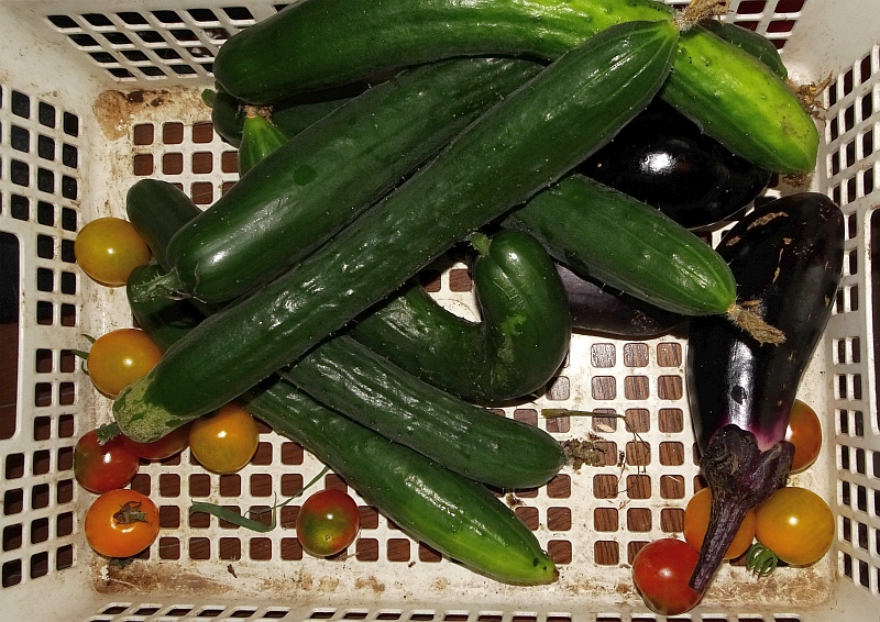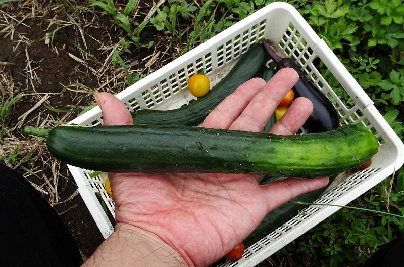 キュウリは相変わらず順調で、毎日でかいやつから5、6本採っている。食い切れなくて溜まっていく。