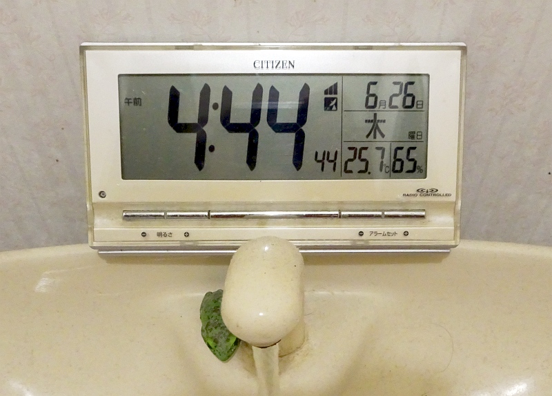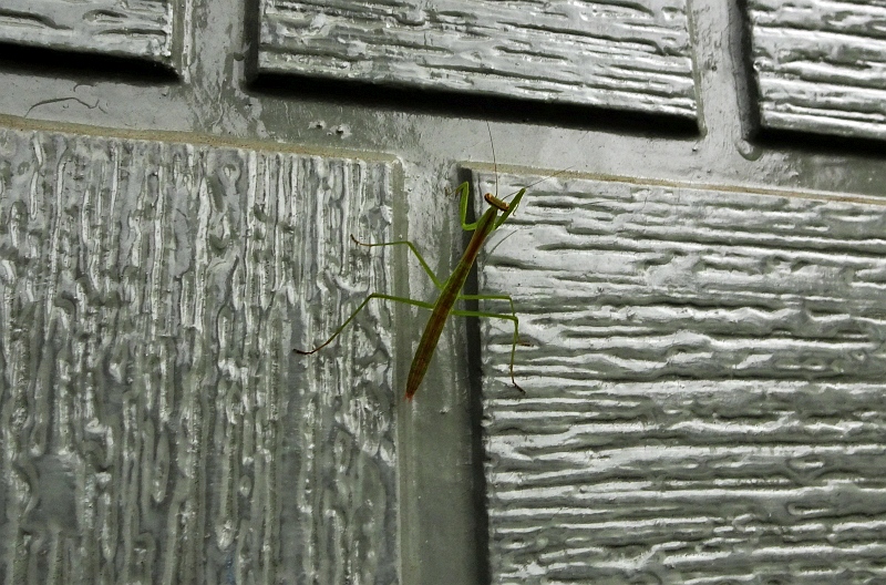 玄関脇にいた生まれて間もないカマキリ。ドラムのような音は雨の音