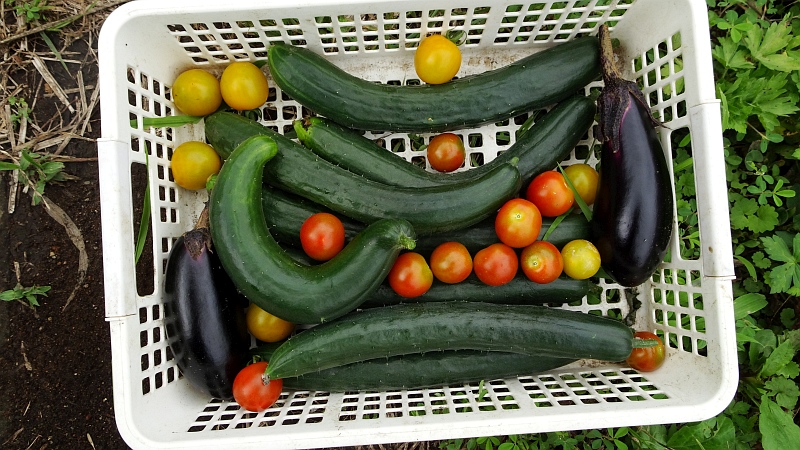 本日の収穫。昨日は雨で外に出なかったので、いっぱいある。籠を持ち上げたらすごく重かった。種は吹けば飛ぶ小ささ、軽さなのに、そこから数か月でこれだけの重量のものができる。植物って不思議だなぁと改めて思う。