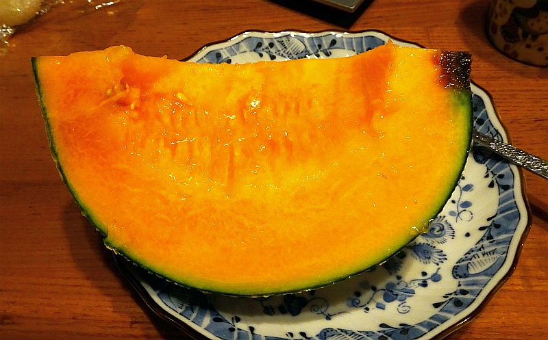 助手さんがご近所にキュウリを数本お裾分けしに行ったら、お返しにこれをもらってきた。助手さんは西瓜やメロンは食べないので(好きじゃないらしい)、あたしが2日に分けて全部食うことに