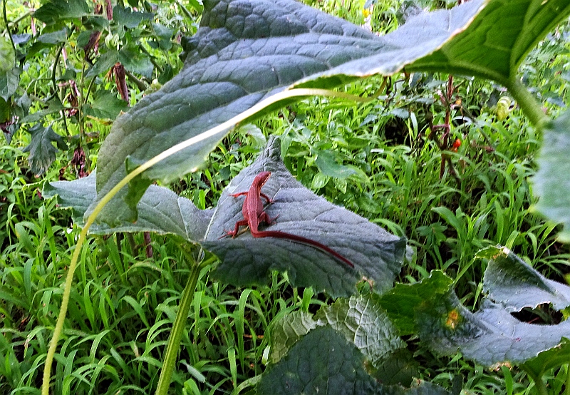 キュウリの葉っぱの上にいたカナヘビ。ずいぶん色鮮やかだな