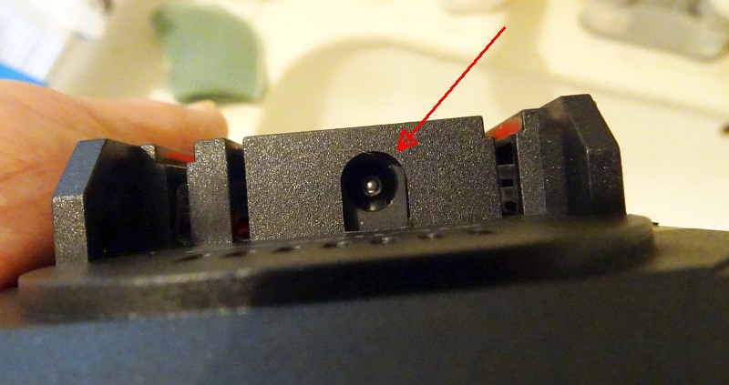 充電器ではなく、AC/DCアダプターがついてきた。はて……と思ってよく見ると、なんとバッテリー本体に充電用のソケットがついていた。バッテリーが熱いときには充電ランプが点かず(緑点灯)、バッテリーが冷えてきてから赤く灯る。どうも、使用直後でバッテリーが熱を持っているときは充電しない安全設計になっているようだ。
