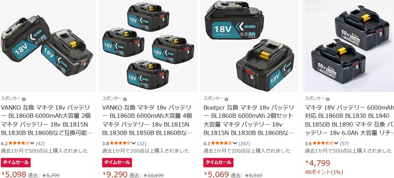 マキタ互換を謳っているバッテリーは大量に出回っていて、2個5000円前後。