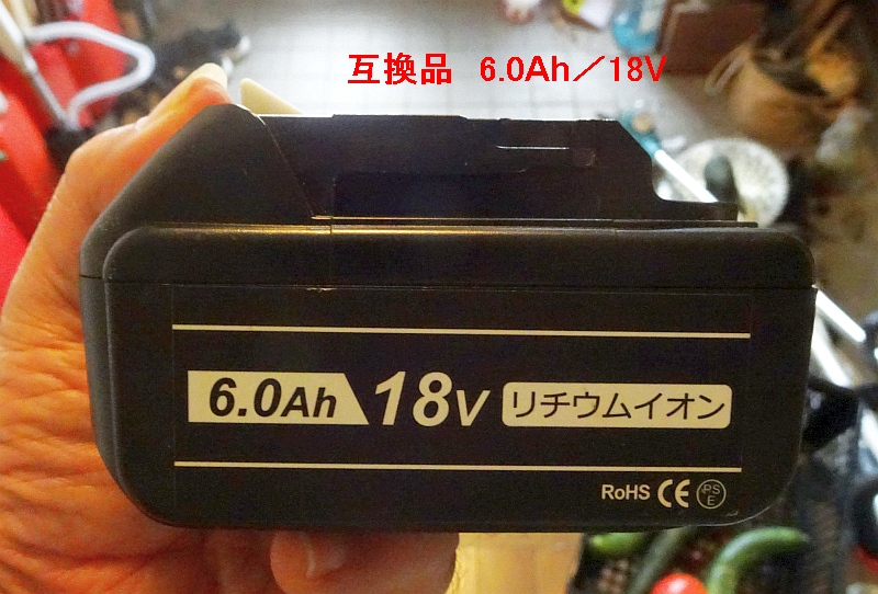 ↑↓マキタの草刈り機にいつも使っている互換バッテリー。容量が6.0Ahで、附属してきた純正より長時間もつ