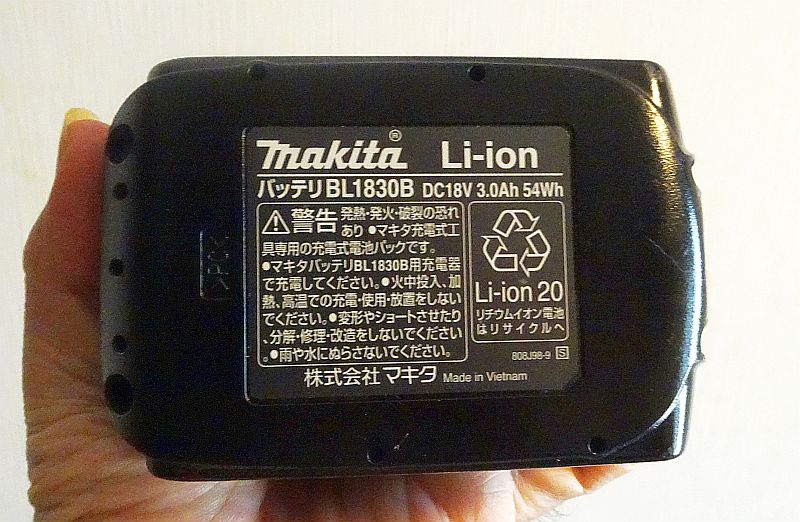 ↑↓マキタ製草刈り機(メインマシン)に附属してきた純正バッテリー。容量は3.0Ah)。ベトナム製だった