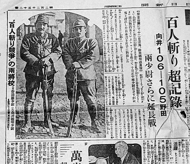 (本文) 【紫金山麓にて十二日浅海、鈴木両特派員発】南京入りまで〝百人斬り競争〟といふ珍競争を始めた例の片桐部隊の勇士向井敏明、野田巌(原文通り)両少尉は十日の紫金山攻略戦のどさくさに百六対百五といふレコードを作つて、十日正午両少尉はさすがに刃こぼれした日本刀を片手に対面した