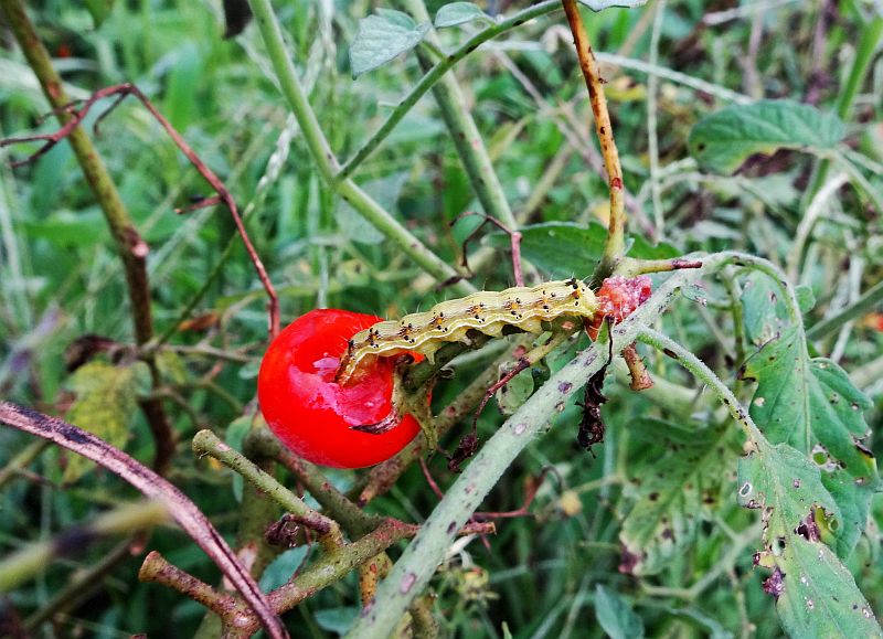 ミニトマトを食っている毛虫