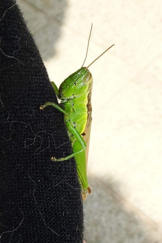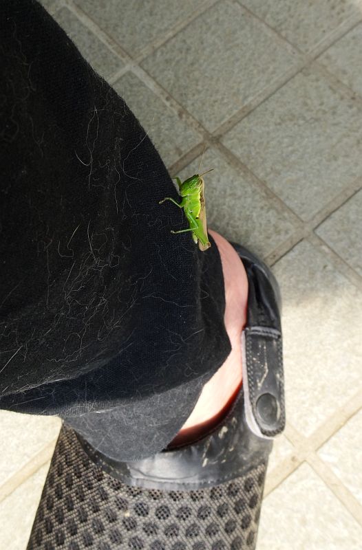 玄関ドアの内側の取っ手にいて、分からずに握ろうとしたら手の中で何か変な感触があった。パッと飛びだして、今度は脚にとまった。潰さなくてよかった。